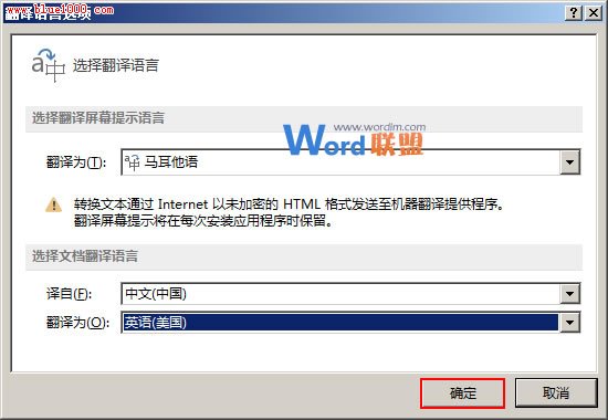 2.彈出的對(duì)話框中“選擇文檔翻譯語言”——“翻譯為”的選項(xiàng)框中下拉選擇“英語(美國(guó))”,然后點(diǎn)“確定”,如圖 2、圖 3