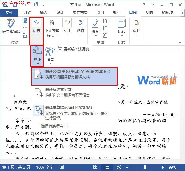 1.首先用word 2013打開需要翻譯的文檔,本教程就以中文翻譯成英語為例吧。“審閱”——“語言”——“翻譯”——“選擇轉(zhuǎn)換語言”。如圖1