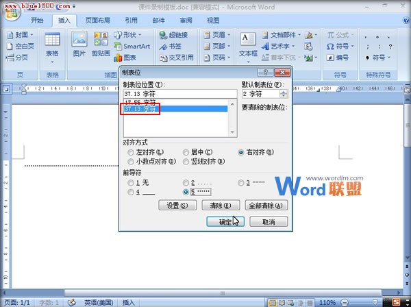 5、現(xiàn)在我們的裁剪線的前半部分已經(jīng)做好了,后半部分的制作和前半部分一樣,雙擊制表位,不過這次選擇的是37.13字符,前導(dǎo)符還是選5號(hào),確定。