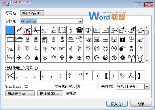 4、選“符號(hào)”菜單,字體設(shè)置為"Wingdings",把“剪刀”圖形選中,點(diǎn)“插入”。
