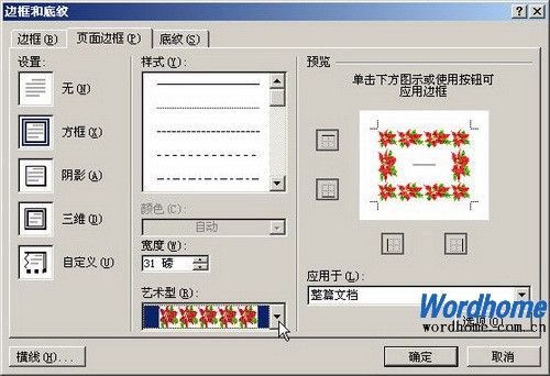 第2步,在打開的“邊框和底紋”對話框中切換到“頁面邊框”選項卡,然后在“樣式”列表或“藝術型”列表中選擇邊框樣式,并設置邊框寬度。設置完畢單擊“確定”按鈕,如圖所示。