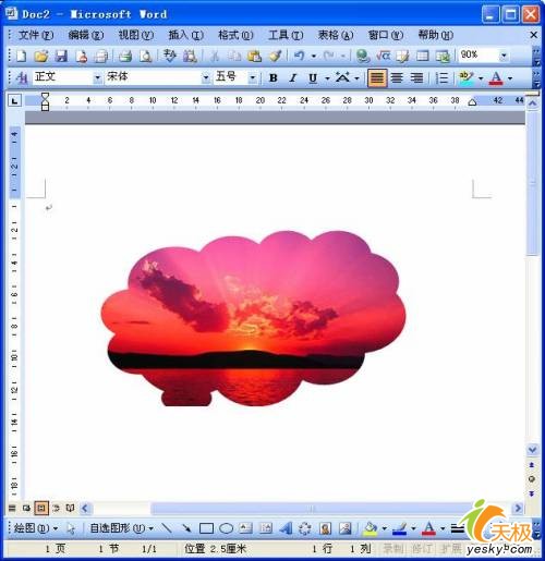 2、進入Word中,利用“繪圖”工具欄上的相關按鈕,根據裁剪的需要,在文檔中繪制出一個封閉的異形圖形。此處,為了方便,我們直接用“云形標注”自選圖形來操作(如圖1)。