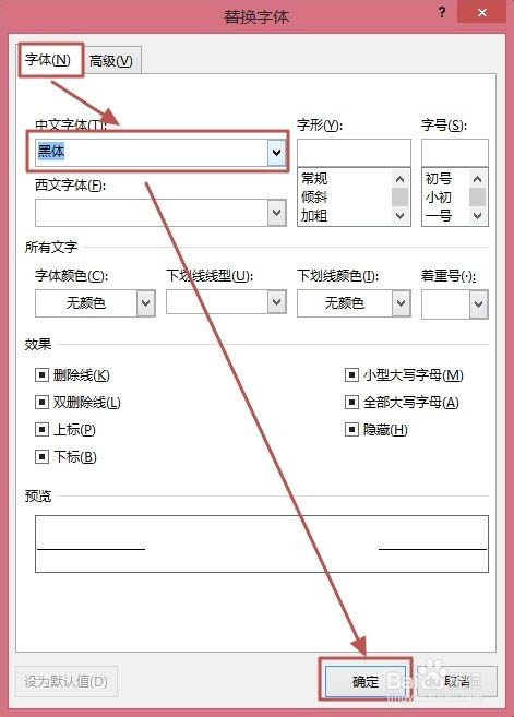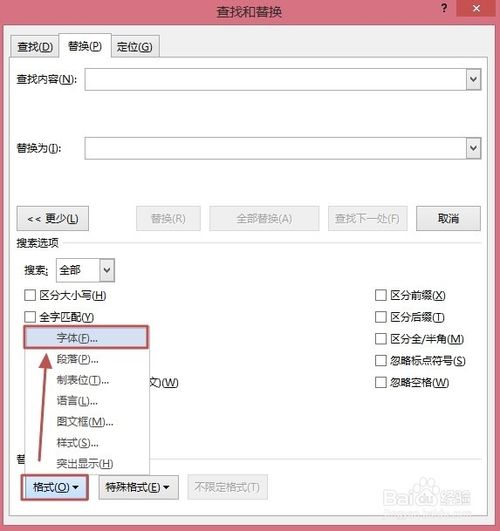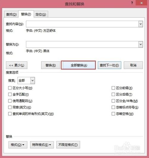 6、返回到“查找和替換”對話框,將光標定位到“替換為”右側的文本框中。使用上述同樣的辦法選擇字體。