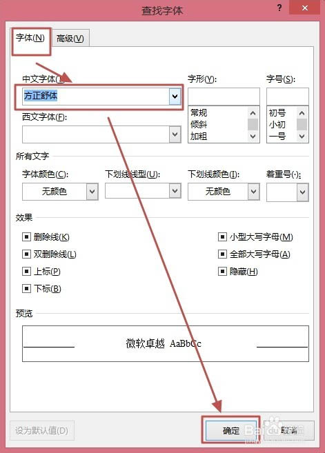 5、在“查找字體”對話框“字體”選項卡,中文字體選擇“方正舒體”,然后單擊“確定”。
