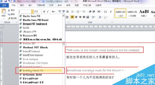 5、這時我們來演示一下,全選所有中英文文本,點擊字體,在中文字體中隨意切換,由于Word2010版本有一個預覽模式,可以直接在頁面上看到中文字體的不斷改變,而英文字體沒有任何變化,不受到影響