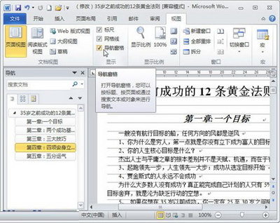 “導(dǎo)航窗格”主要用于顯示W(wǎng)ord2010文檔的標(biāo)題大綱,用戶可以單擊“文檔結(jié)構(gòu)圖”中的標(biāo)題可以展開或收縮下一級標(biāo)題,并且可以快速定位到標(biāo)題對應(yīng)的正文內(nèi)容,還可以顯示W(wǎng)ord2010文檔的縮略圖。選中或取消“導(dǎo)航窗格”復(fù)選框可以顯示或隱藏導(dǎo)航窗格,如圖3所示。