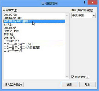 第2步,打開“日期和時間”對話框,在“可用格式”列表中選擇合適的日期或時間格式,也可以選擇日期和時間的組合格式。如果選中“自動更新”復選框,則可以在每次打開該Word文檔時,根據當前系統的日期和時間自動更新。設置完畢單擊“確定”按鈕,如圖2所示。