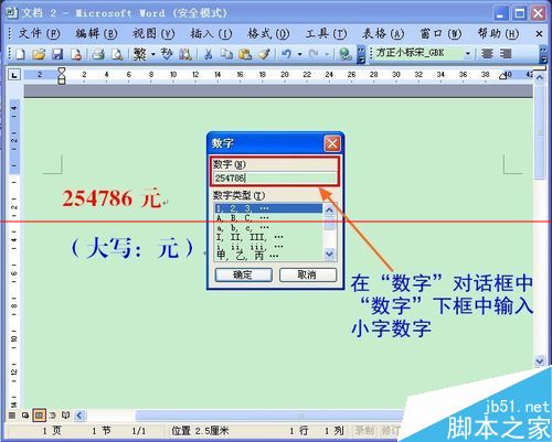 第四步:在“數字”對話框中“數字”下框中輸入小字數字。