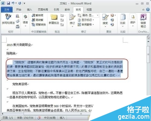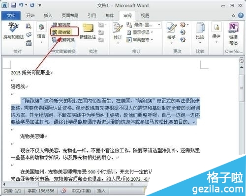 在文檔中選擇要轉換的文字,并切換至【審閱】選項卡。如圖所示。
