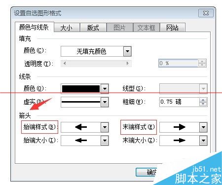 第四,設(shè)置箭頭格式。在對(duì)話框的顏色與線條一覽的最下方,有箭頭的設(shè)置,分別將始端樣式和末端樣式設(shè)置為箭頭即可,點(diǎn)擊確定!