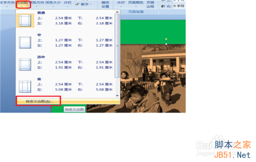 6、如果感覺插入的圖片比較靠上的話,可以進行頁邊距的設置,在工具欄中找到頁面布局,找到頁邊距,單擊一下,找到自定義,再單擊一下,把頁邊距的上方設置的數值大一些就可以了。