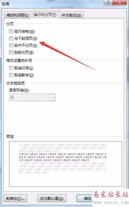 4、在打開的頁面中找到“與下段同頁”一項,然后勾選該項