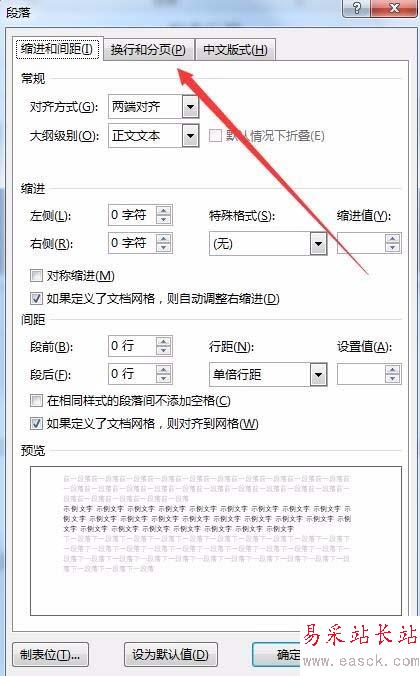 3、在打開的段落設置窗口中,點擊上面的“換行和分頁”標簽
