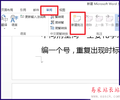 2、點擊Word上的【審閱】-【新建批注】,就會在這一句后面添加一個批注,你可以填寫一些內容