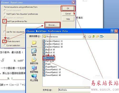 在“Format Equations”對話框選中中間的“MathType preference file”單選項,再選中下方“Range”項目中“Whole document”單選項,單擊“Browse”按鈕,找到我們保存好的那個NewStyle.eqp文件并雙擊。然后最后單擊Ok: