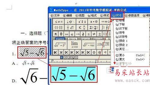 雙擊要修改的公式,打開MathType的編輯窗口。選擇公式之后,依次單擊“尺寸,重新定義”: