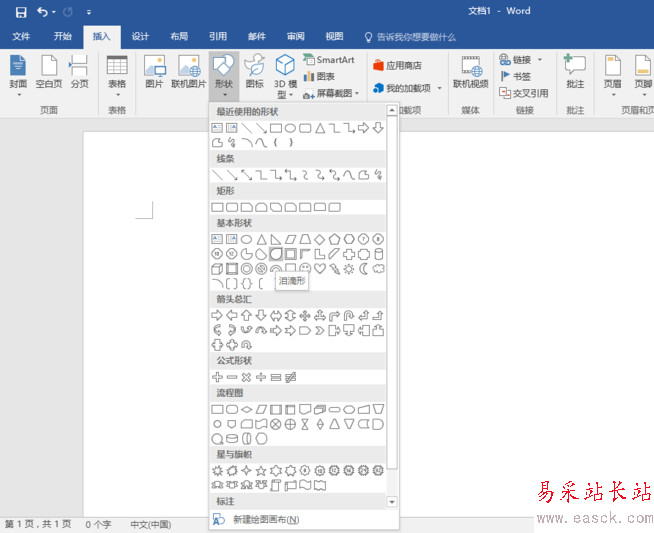 6、點擊"形狀"向下箭頭,選擇"基本形狀→淚滴形"。