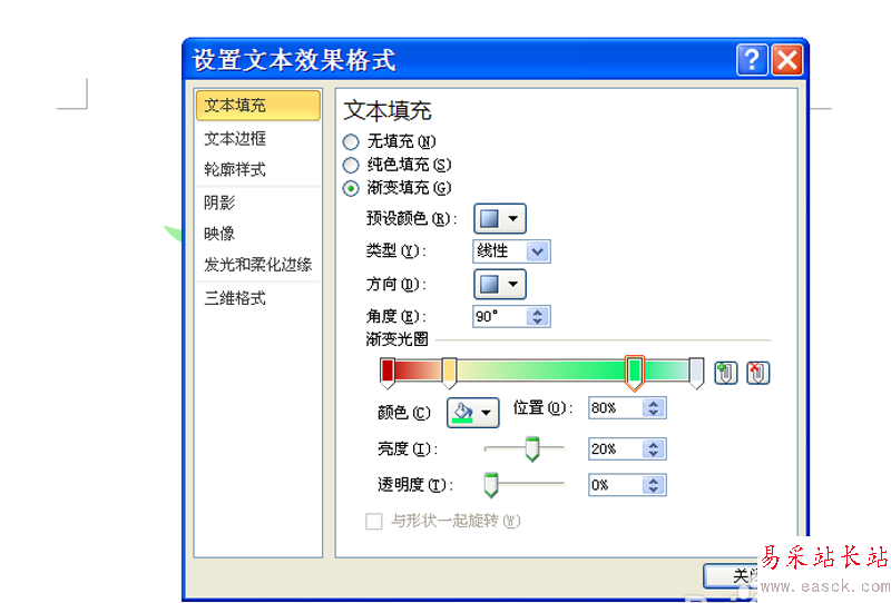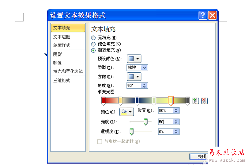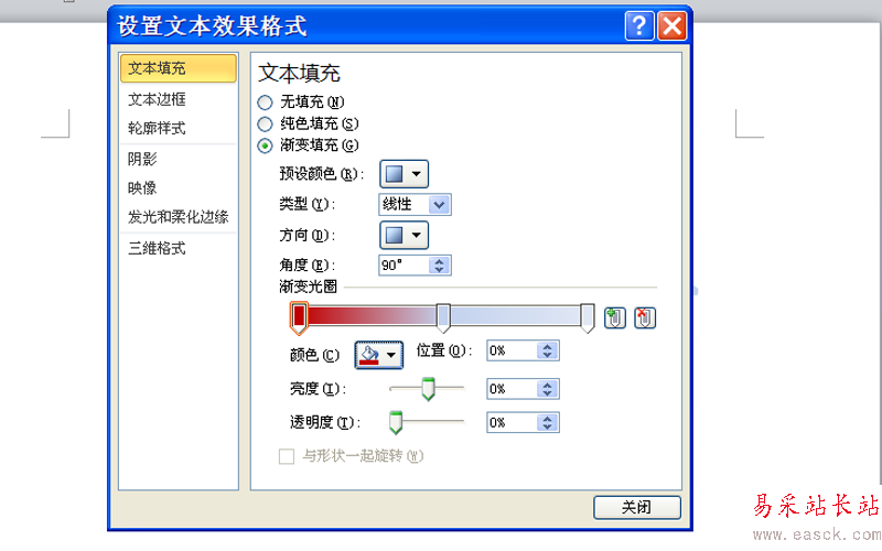 3、設置文本填充為漸變填充,類型為線性,角度為90度,選擇第一個光圈設置為深紅。