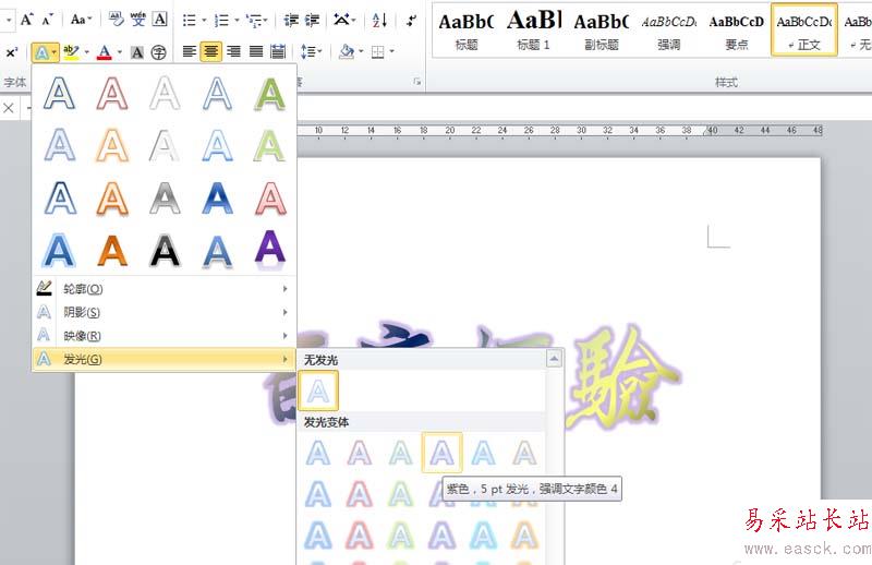 6、點擊關閉按鈕,查看效果,設置文本效果-發光命令,設置為紫色發光,這樣就完成了所有操作過程。