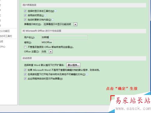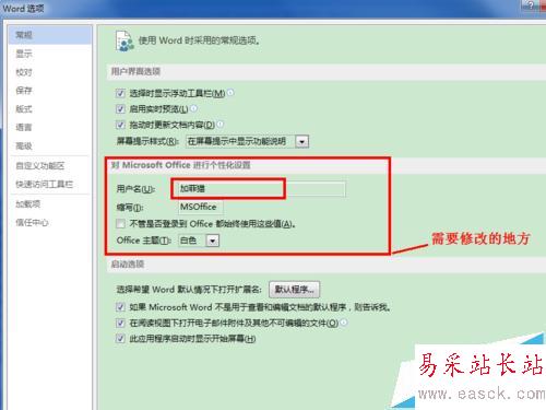 5、進入“常規”子菜單后,在右面面板上找到“對Microsoft Office 進行個性化設置”子項,在這里,就可以進行修改了。我們把用戶名改為自己的名字,如這里修改為“加菲貓”。