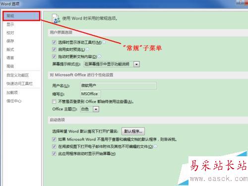 4、打開word選項面板后,找到“常規”子菜單,一般默認進入的就是“常規”子菜單,如果不是,則可以點擊進入。進入后,我們可以在右面進行設置。