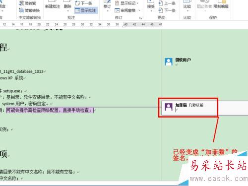 7、在word菜單欄“審閱”面板中,點擊“新建批注”,則可以看到批注的簽名已經變成了“加菲貓”,證明,我們的修改已經生效。