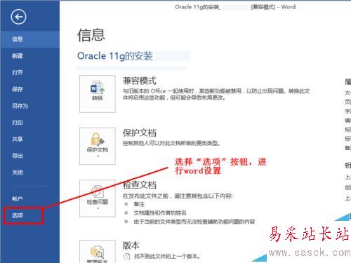 3、點開“文件”后,可以看見面板左側菜單,我們點擊最后一項“選項”,打開word選項面板,則可以在面板中進行word設置了。