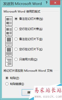 3、在彈出對話框中,選擇導出后的版式,示例中為備注在幻燈片旁。