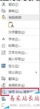 關閉注冊表編輯器,然后打開 Word2013 ,選擇任意字符后右擊,即可發現默認的搜索引擎已經變成了 使用百度搜索 。點擊 是用百度搜索 :
