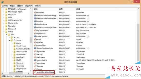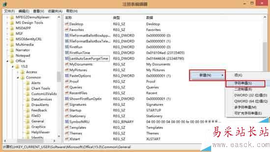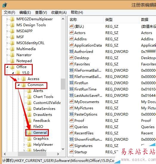 依次雙擊打開左側的HKEY_CURRENT_USER,Software,Microsoft,Office,15.0,Common,General:
