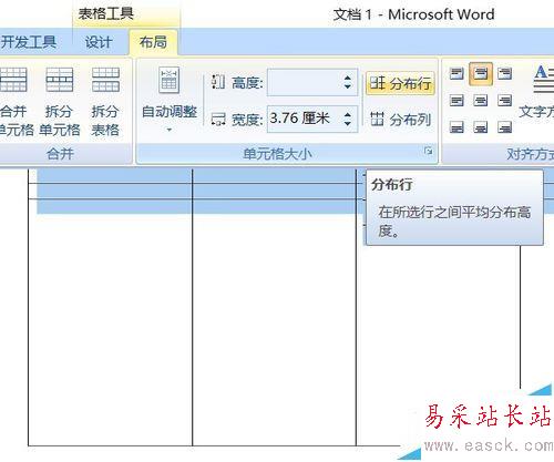 4、插入后的表格很小,將最后一行向下拉至底部,然后在表格工具——布局——單元格大小中選“分布行”。