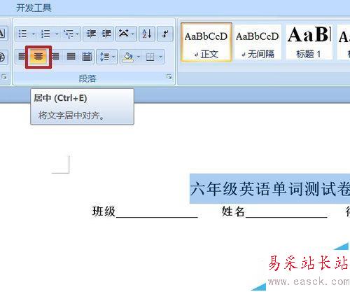 1、輸入試卷標題,開始——段落中,選擇居中對齊。