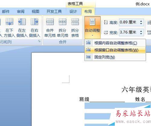 5、完成后的表格位置偏向右邊,在布局中選擇自動調整——根據窗口自動調整表格。將表格移至正中。