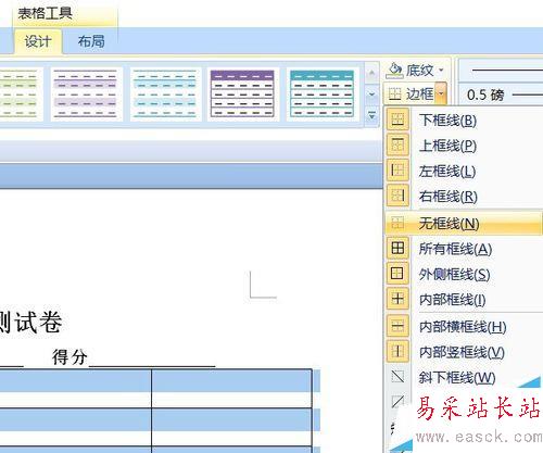 6、表格只是用來對齊文字,不是要看到表格,所以,去除表格線。表格工具——設計——邊框——無框線。