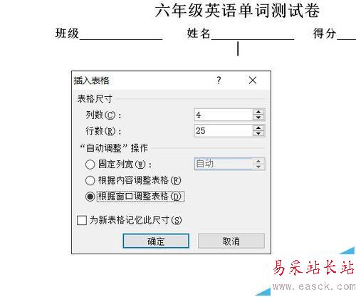 3、彈出的面板中,設置行數與列數,因為正好100個,所以列數為4,行數為25,自動調整操作選“根據窗口調整表格”。