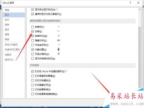 6、在“顯示”選項卡的右側(cè)窗格中,找到“始終在屏幕上顯示這些格式標記”區(qū)域下的“空格”選項,并將其復(fù)選框勾選即可。如圖所示;