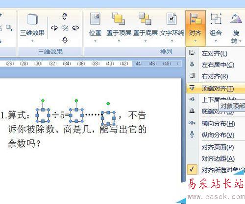 5、按住shift鍵同時選中三個方框,在繪圖工具——格式工具欄中,點開對齊按鈕,圖中前面兩個所在位置比較合適,最后一個偏低,所以,我選擇頂部對齊,使三個方框以最高的一個頂部為準,對齊放置。