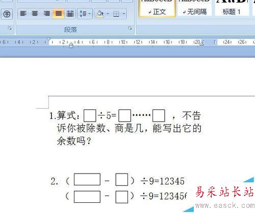 數學式中常需要輸入方框表示需要填空的部分,如果用插入符號,雖然方便,但是與文字同字號時會顯得太小,單獨放大字號,該行間距會增大;或者該方框需要較長,則無可用符號。這時,我常用矩形來制作這種式子。