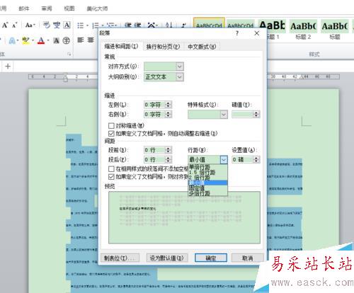 4、在“開始”中點擊“段落”的右下角斜箭頭,在設置框中“行距”調成最小值,并且將設置值調成0磅,點擊右下角確定,這是一篇好幾頁的文章已經被縮到了一頁紙上,而且十分緊湊。
