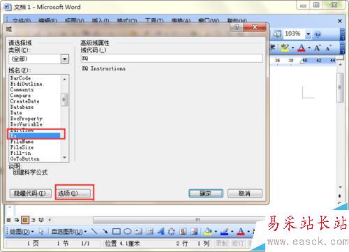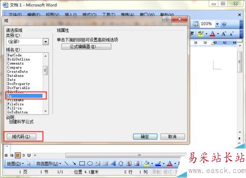 4、編輯域0。在新出來的界面中的“域名”一欄選中“Eq”,,然后單擊“域代碼”如圖中所示;