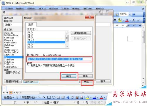 7、完成編輯域:同樣的方法,直到實(shí)現(xiàn)如下命令“EQ /F(1,2) + /F(1,3) + /F(1,5) + /I(0,0,xdx)”,接著一直單擊“確定”;