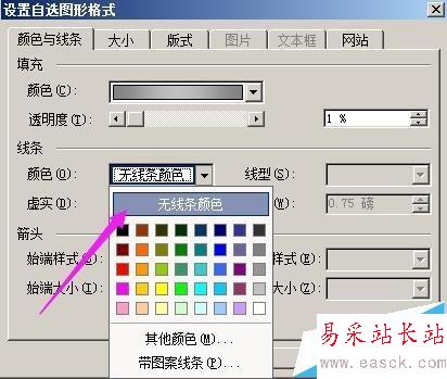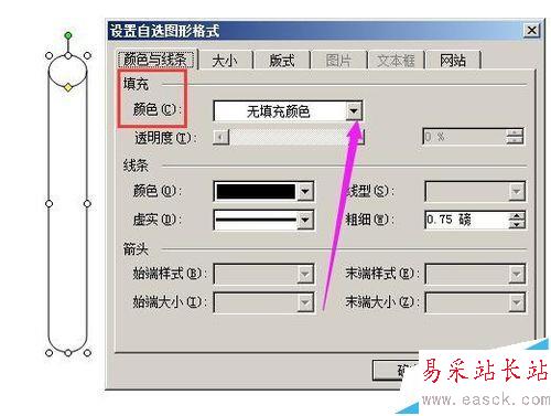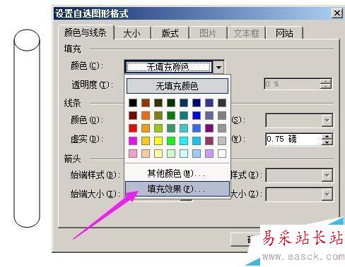 5、點確定后,轉回到“自選圖形格式”操作框,在“線條顏色”右側的三角形點下,在彈出的菜單中點“無線條顏色”;然后,點確定。圓柱形的效果如圖所示。