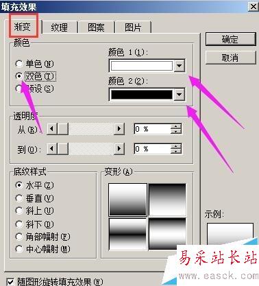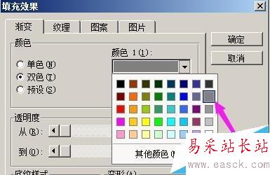 3、彈出菜單中點“填充效果”,轉到另一個操作框,點“雙色”,然后,在“顏色1”右側的三角形點下,彈出顏色選項,選擇“灰色-50%”;
