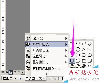 1、新建word文檔,在文檔的繪圖工具欄中點“自選圖形”右側的三角形;在彈出的各種圖形中點選“圓柱形”;