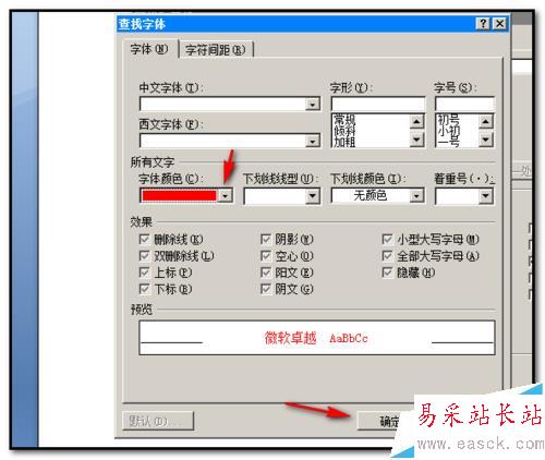 6、彈出設(shè)置框,在框內(nèi)“字體顏色”這里,點下三角,彈出的顏色選項中點選紅色;然后,再點確定。