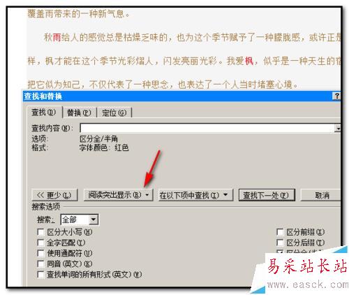 7、點確定,轉(zhuǎn)回到查找框,在“閱讀突出顯示”這里點下;