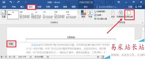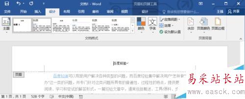 進入頁眉編輯模式以后,點擊設計中的頁眉邊框打開。