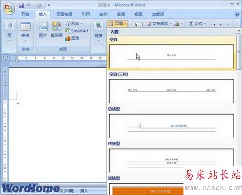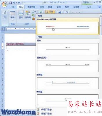 Word2007中的庫主要集中在“插入”功能區(qū)中,用戶也可將自定義的設(shè)置添加到特定的庫中,以便減少重復(fù)操作。下面以在頁眉庫中添加一項(xiàng)頁眉設(shè)置為例,操作步驟如下所述: