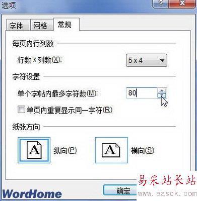 第2步,打開“選項”對話框,切換到“常規(guī)”選項卡。在“字符設(shè)置”區(qū)域調(diào)整“單個字帖內(nèi)最多字符數(shù)”的數(shù)值,并單擊“確定”按鈕,如圖2所示。