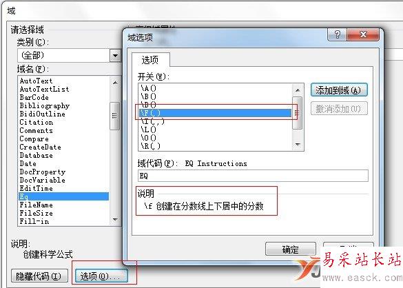 第二步:點(diǎn)擊域代碼后,我們可以看到在其右側(cè)出現(xiàn)一個(gè)“選項(xiàng)”按鈕,單擊“選項(xiàng)”按鈕,選擇選項(xiàng)中的“F(,)”,我們可以看到提示,這是創(chuàng)建在分?jǐn)?shù)線上下劇中的分?jǐn)?shù)。
